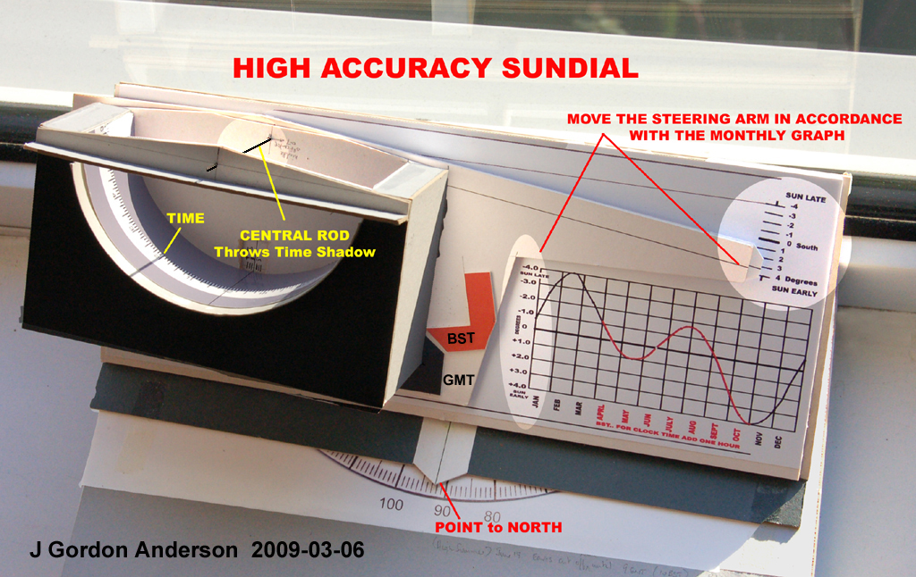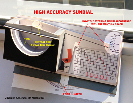 The box can be moved around the gnomon by up to +/- 4 degrees (about quarter of an hour either way) using an arm in order to follow the elliptical graph which is provided alongside, and there you are.